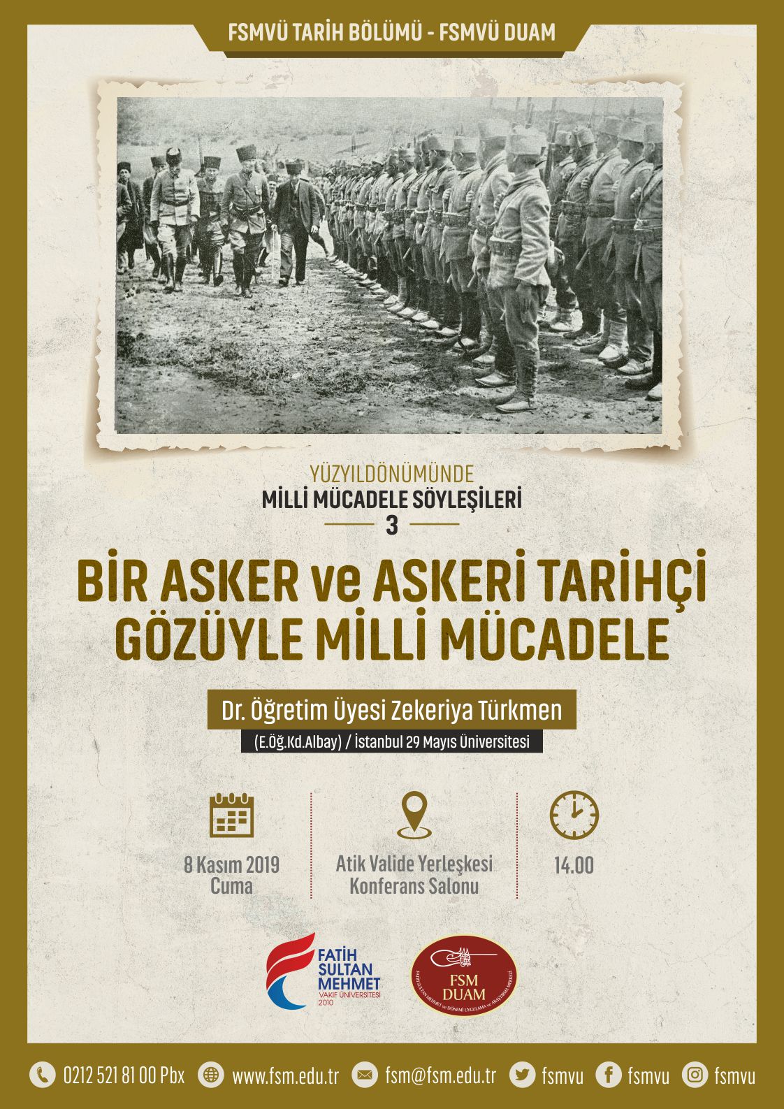 Milli Mücadele’nin yüzüncü yıldönümü dolayısıyla FSMVÜ DUAM’da gerçekleştirilen konferansların üçüncüsü 8 Kasım 2019’da Dr. Öğretim Üyesi Zekeriya Türkmen’in “Bir Asker ve Askeri Tarihçi Gözüyle Milli Mücadele” konulu konuşmasıyla devam ediyor.